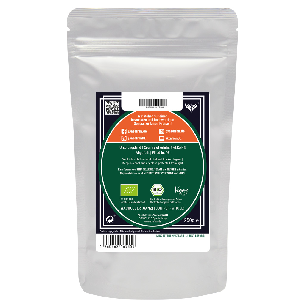 Wacholderbeeren ganz im wiederverschließbaren Aromabeutel (à 250 Gramm) verpackt (Versandkostenfrei innerhalb von Deutschland geliefert).