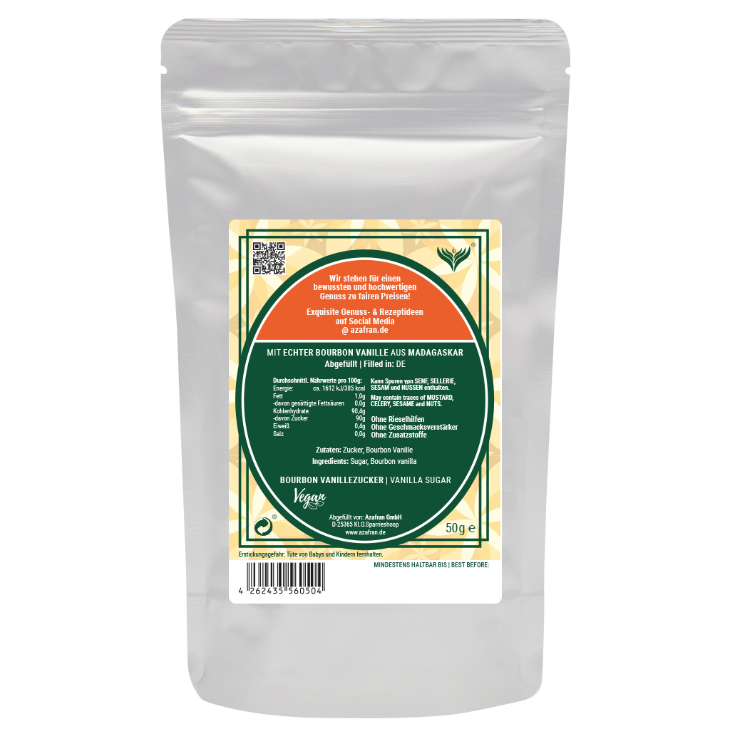 Bourbon Vanillezucker im Aromabeutel (à 50 Gramm) verpackt (Versandkostenfrei innerhalb von Deutschland geliefert).
