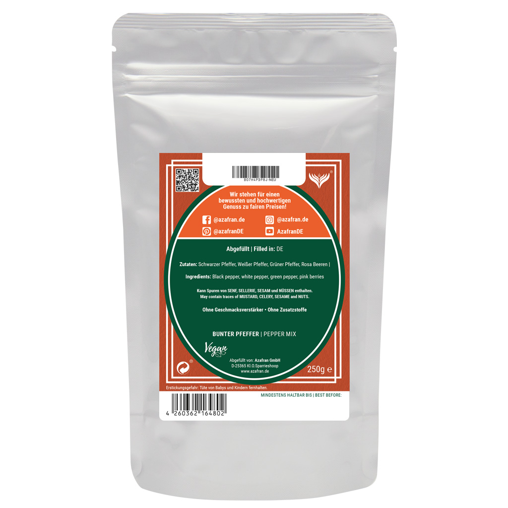 Der Pfeffer-Mix stammt aus verschiedenen Anbaugebieten weltweit und zeichnet sich durch seinen ausgewogenen Geschmack und die bunte Farbe aus.