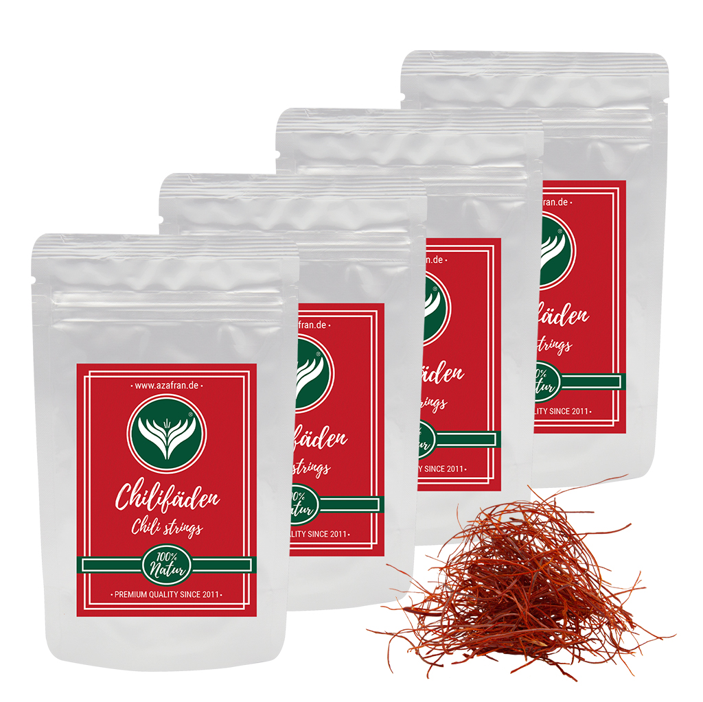 Chili in Fäden im wiederverschließbaren Aromabeutel (à 100 Gramm) verpackt (Versandkostenfrei innerhalb von Deutschland geliefert).