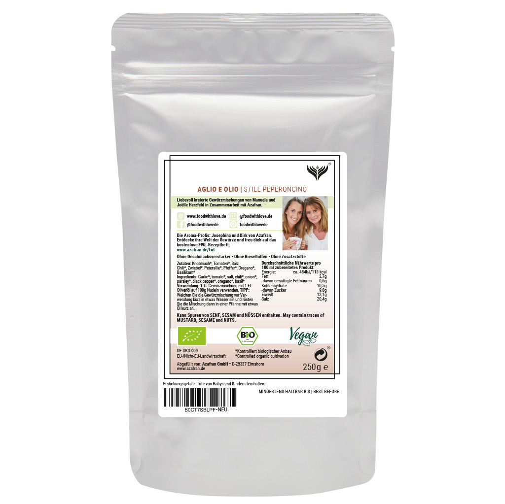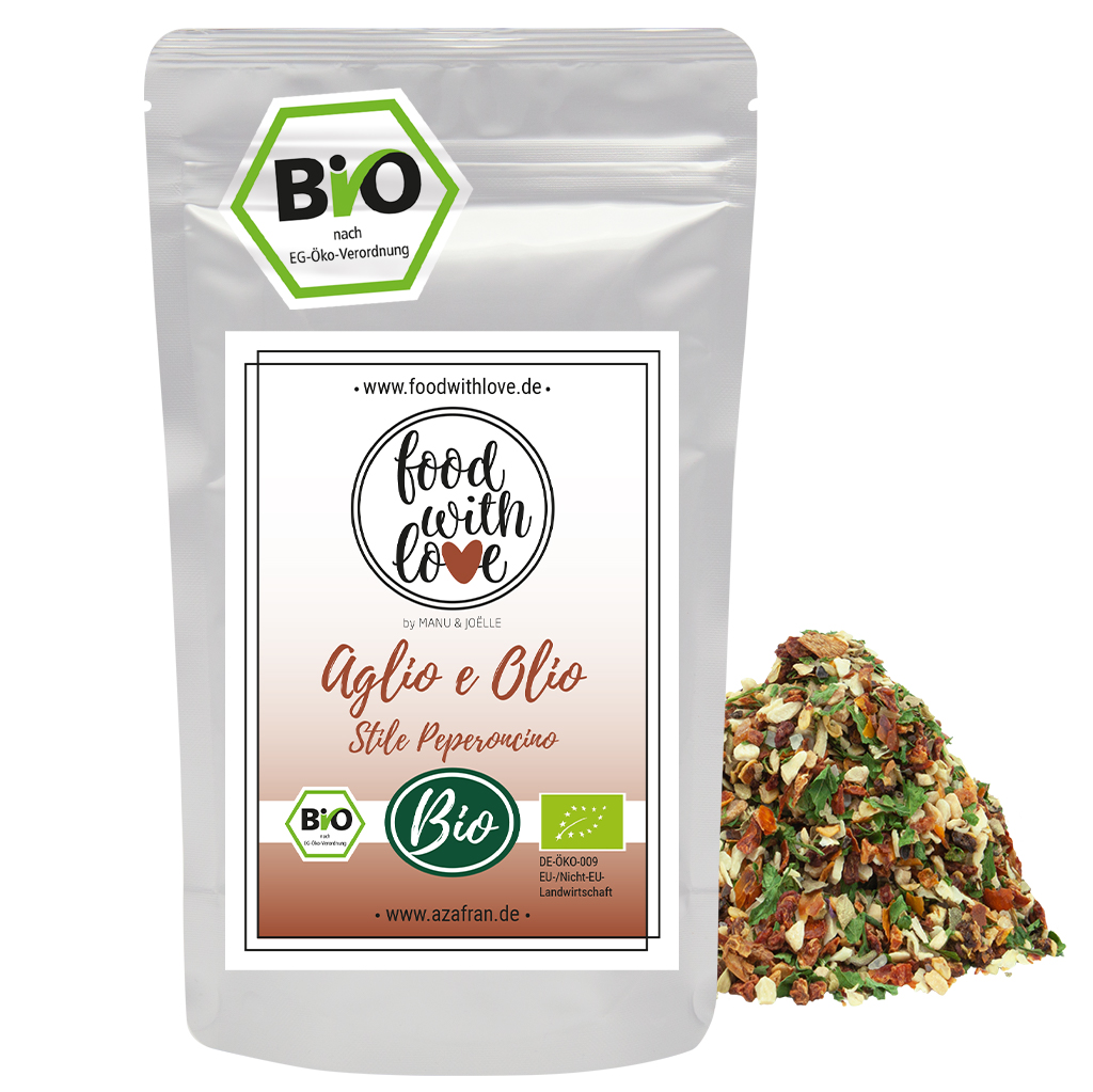 BIO Aglio e Olio Gewürzzubereitung im Aromabeutel (à 250 Gramm) verpackt (Versandkostenfrei innerhalb von Deutschland geliefert).