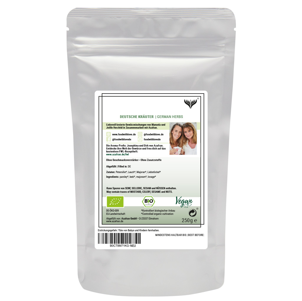 Bei unserer BIO Deutsche Kräuter Mischung handelt es sich um eine typisch deutsche Gewürzmischung aus der aktuellen Food with Love Kollektion, bestehend aus hochwertigen Bio Zutaten.