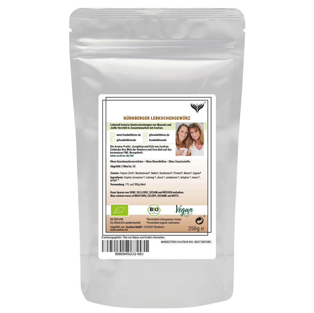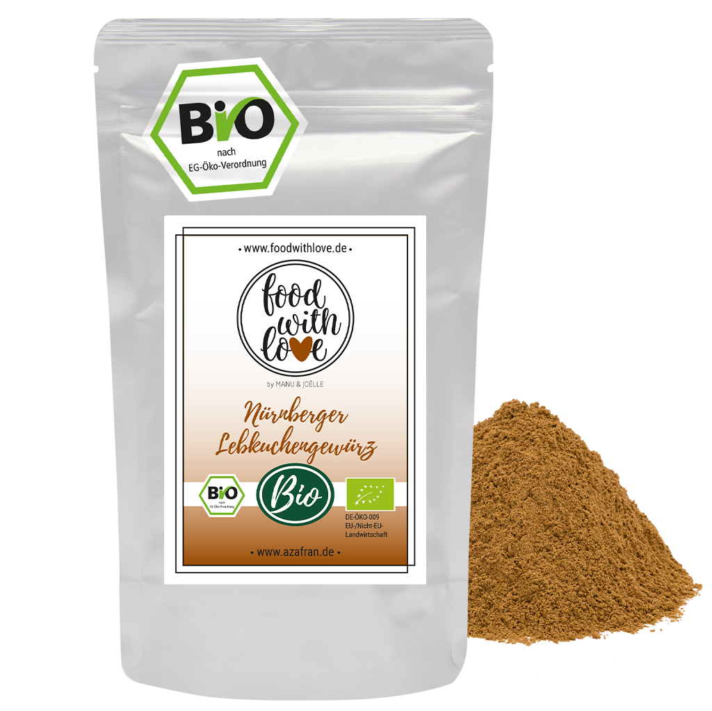 Bei unserem Lebkuchengewürz aus der exklusiven „Food with Love"- Kollektion handelt es sich um eine typisch deutsche Gewürzmischung aus hochwertigen BIO Zutaten.