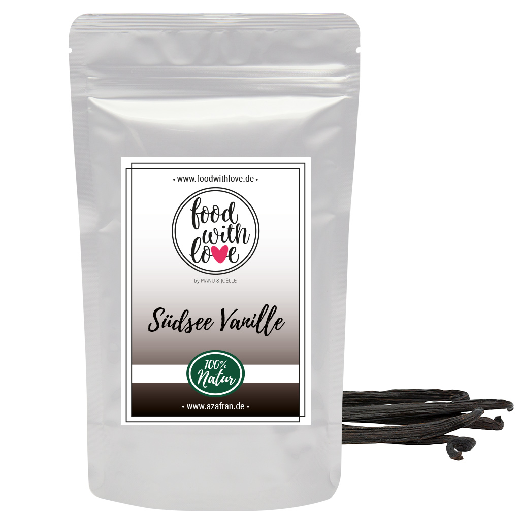 Die Gourmet-Vanilleschoten aus der exklusiven „Food with Love"- Reihe stammen aus Papua-Neuguinea und gehören zu den weltweit begehrtesten und teuersten Vanilleschotenarten. Die Südsee Vanille ist dabei etwas fester und dünner als das Original aus Tahiti. Sie zeichnet sich aber dennoch durch ihre Dicke (gegenüber Bourbon Vanilleschoten) und ihrem einzigartigen würzigen und blumigen „Tahiti-Aroma" aus.