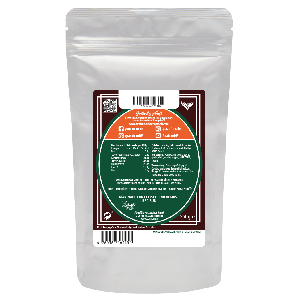 Zutaten: | Paprika, Salz, Roh-Rohrzucker, Knoblauch, Chili, Kreuzkümmel, Pfeffer, Senf, Rauch |