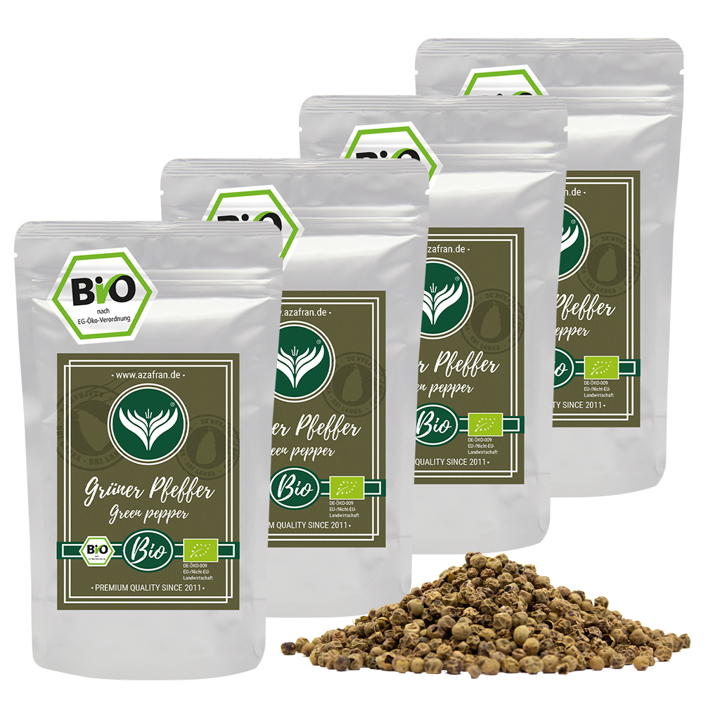 Grüner BIO-Pfeffer im Aromabeutel (à 250 Gramm) verpackt (Versandkostenfrei innerhalb von Deutschland geliefert).
