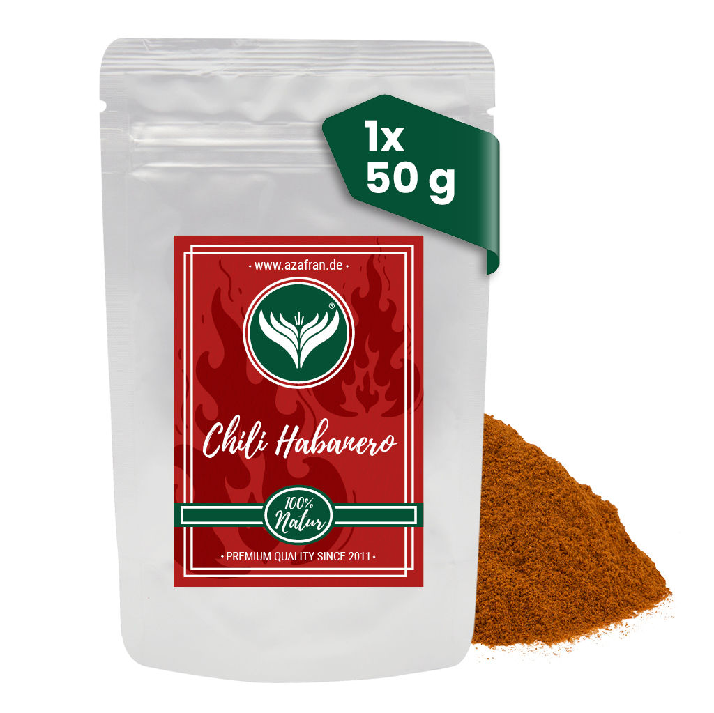 Pulverisiertes Habanero Chili in Premium Qualität im wiederverschließbaren Aromabeutel (à 50 Gramm) verpackt (Versandkostenfrei innerhalb Deutschland geliefert).