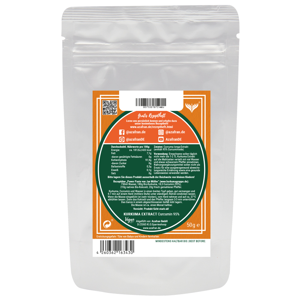 Unser Curcuminpulver wird auf Alkohol / Wasser Basis extrahiert und enthält 95% Curcumin. Preiswertere Kurkuma-Extrakte beinhalten meist synthetisch hergestelltes Curcumin auf Erdölbasis! Unser Curcumin ist zu 100% natürlich und besteht die C14-Analyse (Hinweis: Diese Analyse liegt uns vor und kann Ihnen auf Wunsch gerne zur Verfügung gestellt werden!).
