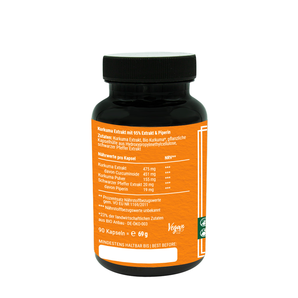| Inhaltsstoffe: | Kurkuma Extrakt, Bio Kurkuma*, pflanzliche Kapselhülle aus Hydroxpropylmethylcellulose, schwarzer Pfeffer Extrakt - *23% der landwirtschaftlichen Zutaten aus BIO Anbau - DE-ÖKO-003 |