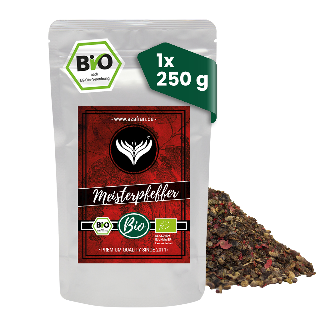 Entdecken Sie den BIO Meisterpfeffer – eine fein abgestimmte Siebenpfeffer-Komposition aus kontrolliert biologischem Anbau. Diese charaktervolle Gewürzmischung überzeugt mit einer warm-würzigen Tiefe, feinen frischen Akzenten und einer klar strukturierten Pfefferlinie. Das Aromabild wirkt vielschichtig und ausgewogen, ohne von übermäßiger Schärfe geprägt zu sein.