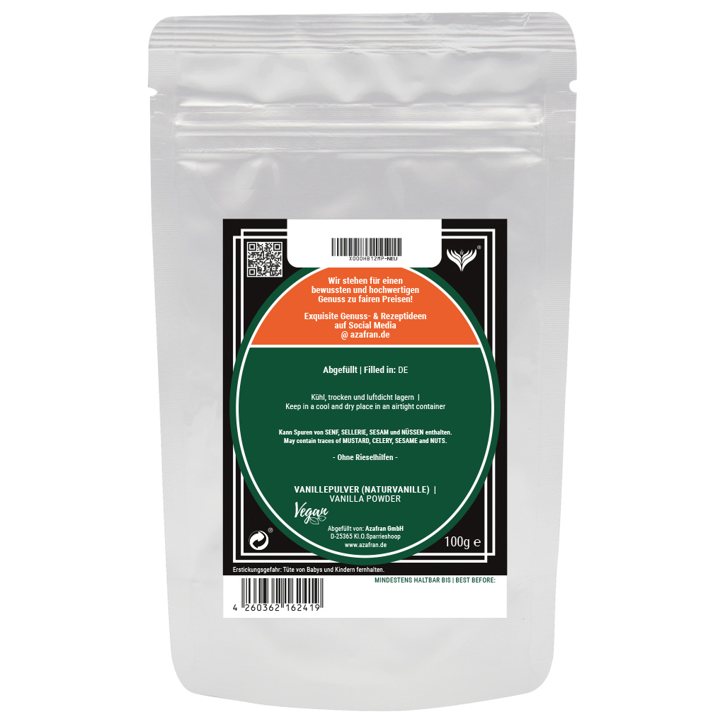 Vanillepulver im wiederverschließbaren Aromabeutel (à 100 Gramm) verpackt (Versandkostenfrei innerhalb von Deutschland geliefert).