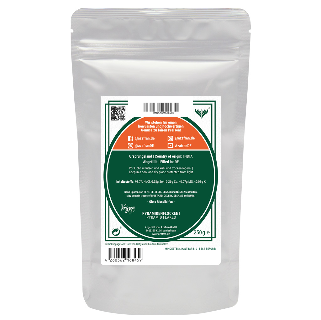 Wer ein Salz mit hohem Wiedererkennungswert sucht, liegt mit dem Azafran Pyramidensalz genau richtig! Optisch und auch geschmacklich ist es einzigartig. Angefangen mit der außergewöhnlichen Form, die an Schneefllocken oder kleine Pyramiden erinnert, bis hin zu dem intensiv-salzigen Geschmack, überzeugt es außnahmlos! Wegen seines dekorativen Attributs wird es auch sehr gerne als Finishing-Salz verwendet.