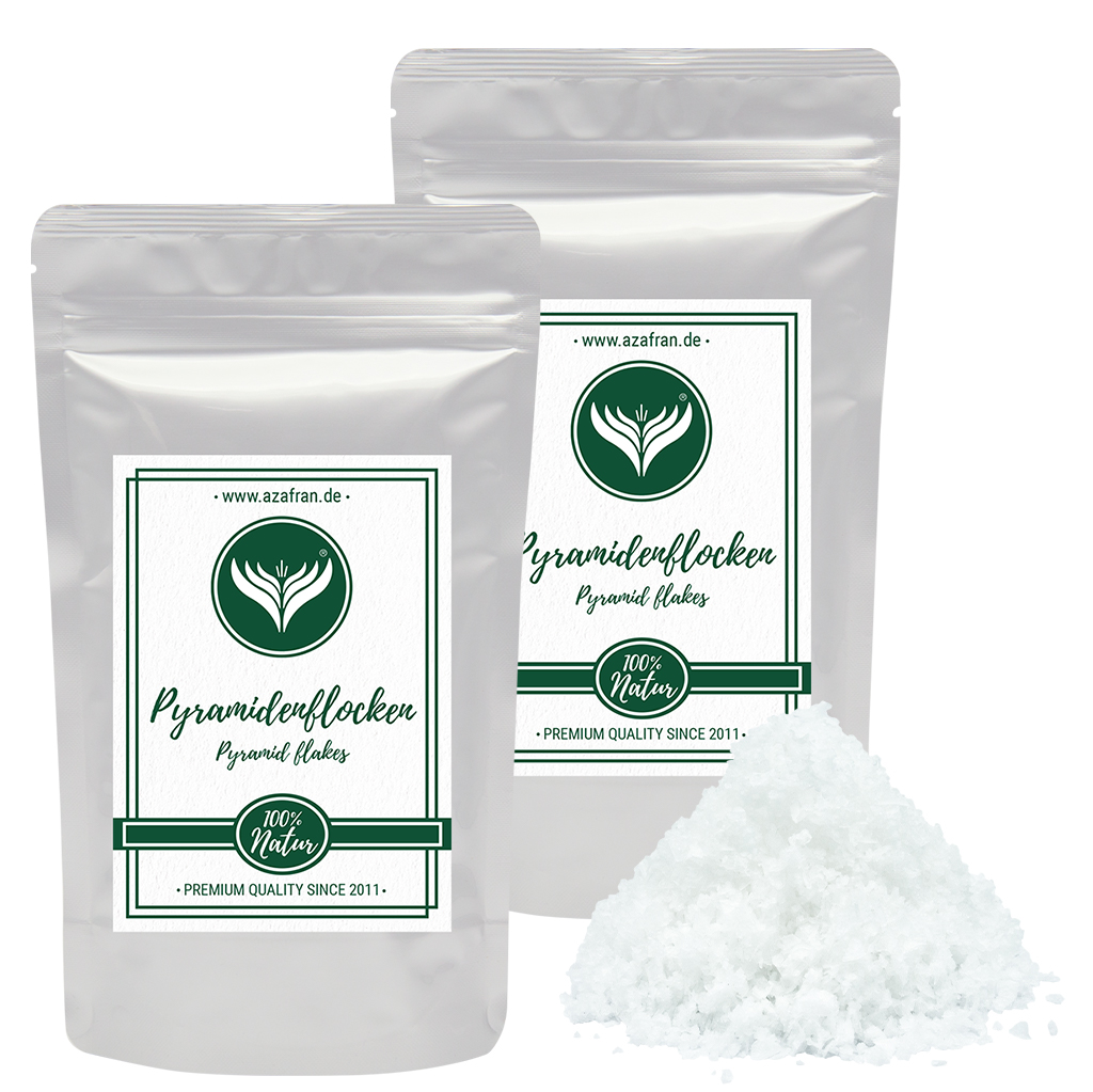 Wer ein Salz mit hohem Wiedererkennungswert sucht, liegt mit dem Azafran Pyramidensalz genau richtig! Optisch und auch geschmacklich ist es einzigartig. Angefangen mit der außergewöhnlichen Form, die an Schneefllocken oder kleine Pyramiden erinnert, bis hin zu dem intensiv-salzigen Geschmack, überzeugt es außnahmlos! Wegen seines dekorativen Attributs wird es auch sehr gerne als Finishing-Salz verwendet.