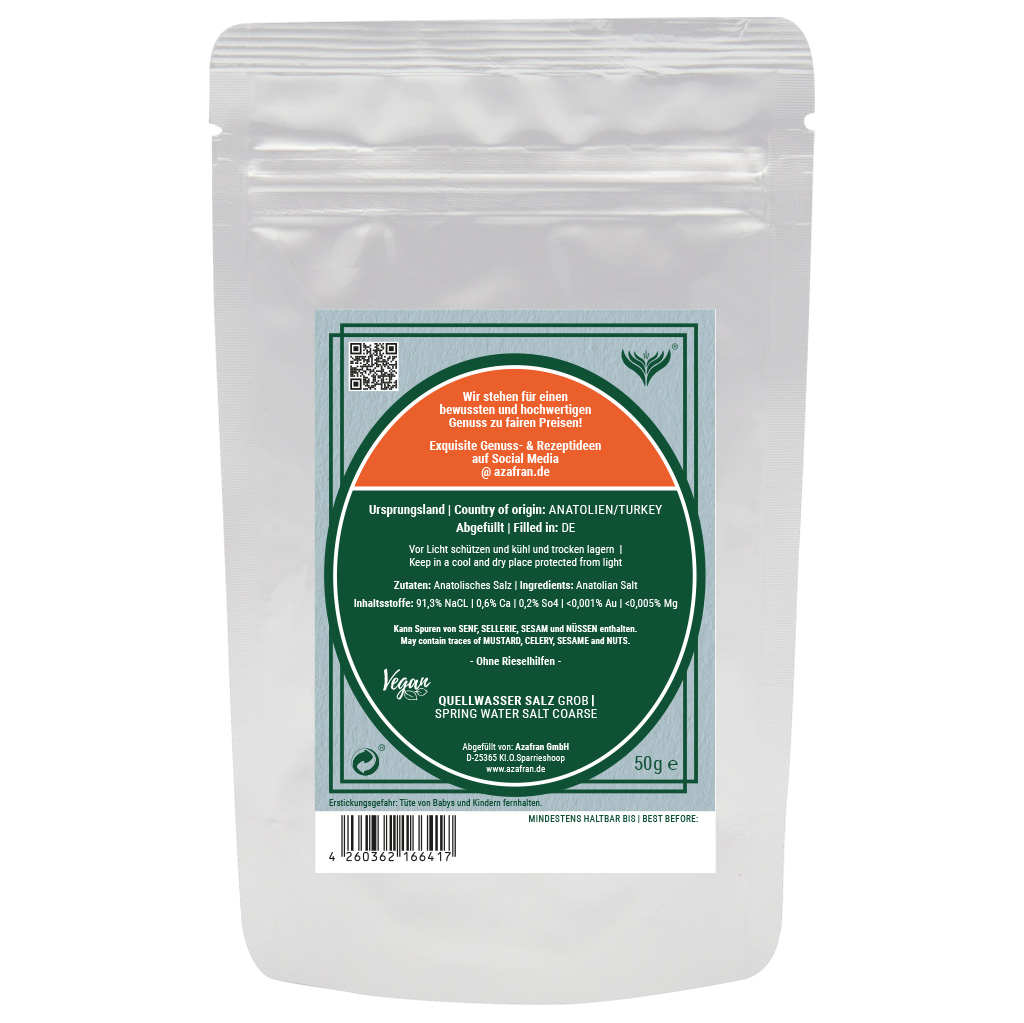 Quellwassersalz (grob) im Aromabeutel (à 50 Gramm) verpackt (Versandkostenfrei innerhalb von Deutschland geliefert).