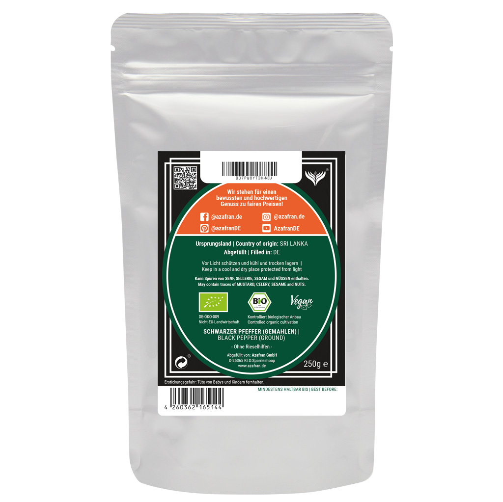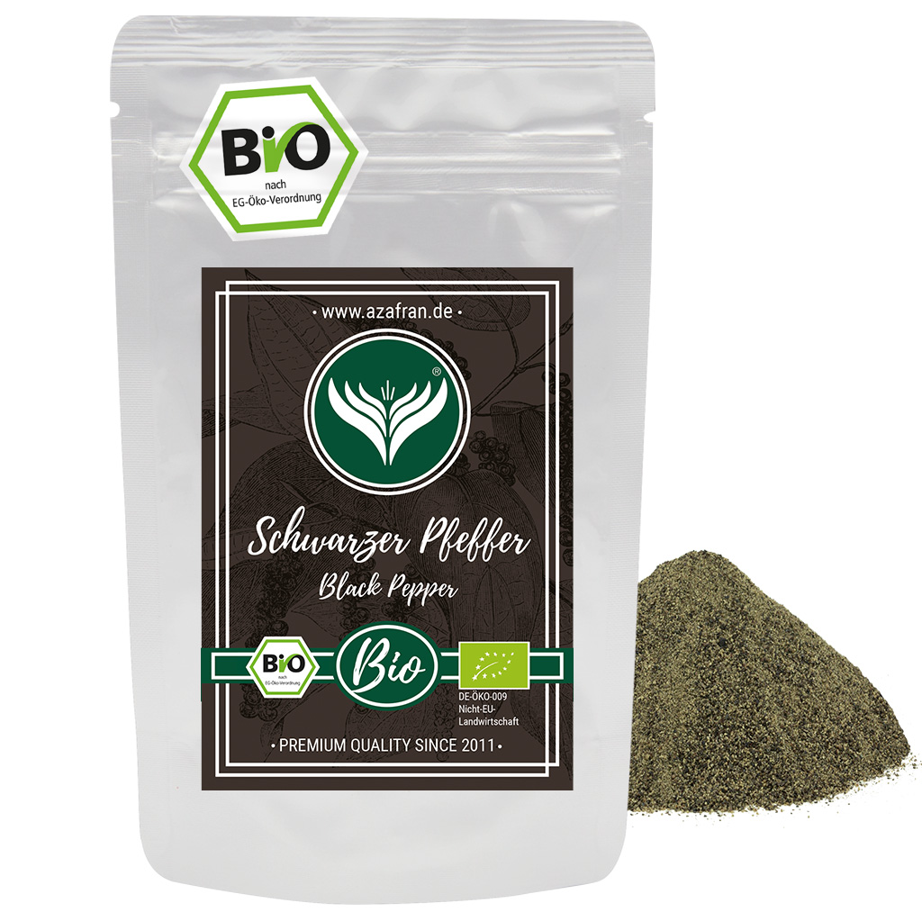 Schwarzer BIO-Pfeffer im Aromabeutel (50 Gramm) verpackt (Versandkostenfrei innerhalb von Deutschland geliefert).