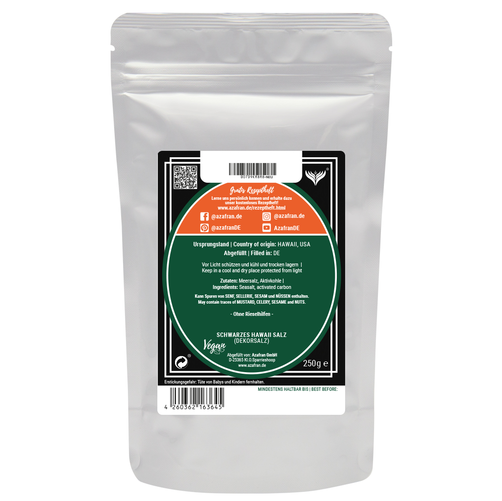 Unser Hawaiisalz stammt aus Meersalz auf Hawaii und wird traditionell mit Aktivkohle eingefärbt. Da in Deutschland eingefärbte Salze nicht als Speisesalz gehandelt werden dürfen, verkaufen wir es als Dekorsalz oder auch Salzzubereitung.