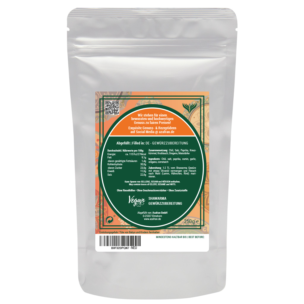 Shawarma Gewürzzubereitung im Aromabeutel (à 250 Gramm) verpackt (Versandkostenfrei innerhalb von Deutschland geliefert).Shawarma Gewürzzubereitung für Sie zum günstigen Preis!