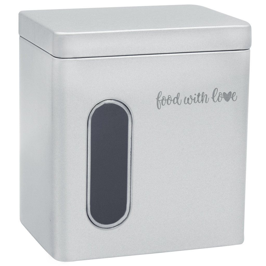 Die Vorratsdose Food with Love hat das Format: 95 x 73 x 104 mm und besteht aus Weißblech. Sie hat einen lebensmittelechten Innenlack und bietet Platz für eine haushaltsübliche Menge Ihres Lieblingsgewürzes (je nach Volumen). Das seitliche Sichtfenster verrät Ihnen außerdem von außen den Inhalt sowie den Füllstand der Dose.