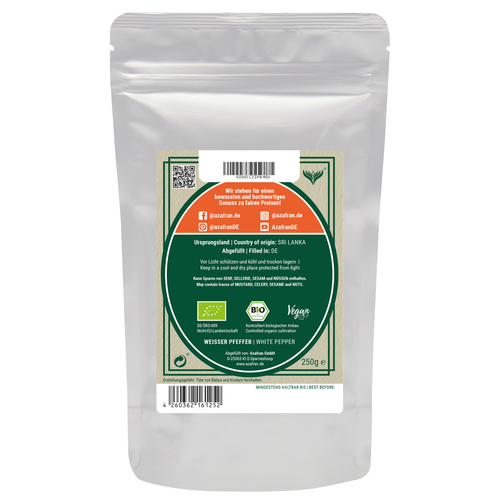 Weißer BIO-Pfeffer im Aromabeutel (à 250 Gramm) verpackt (Versandkostenfrei innerhalb von Deutschland geliefert).