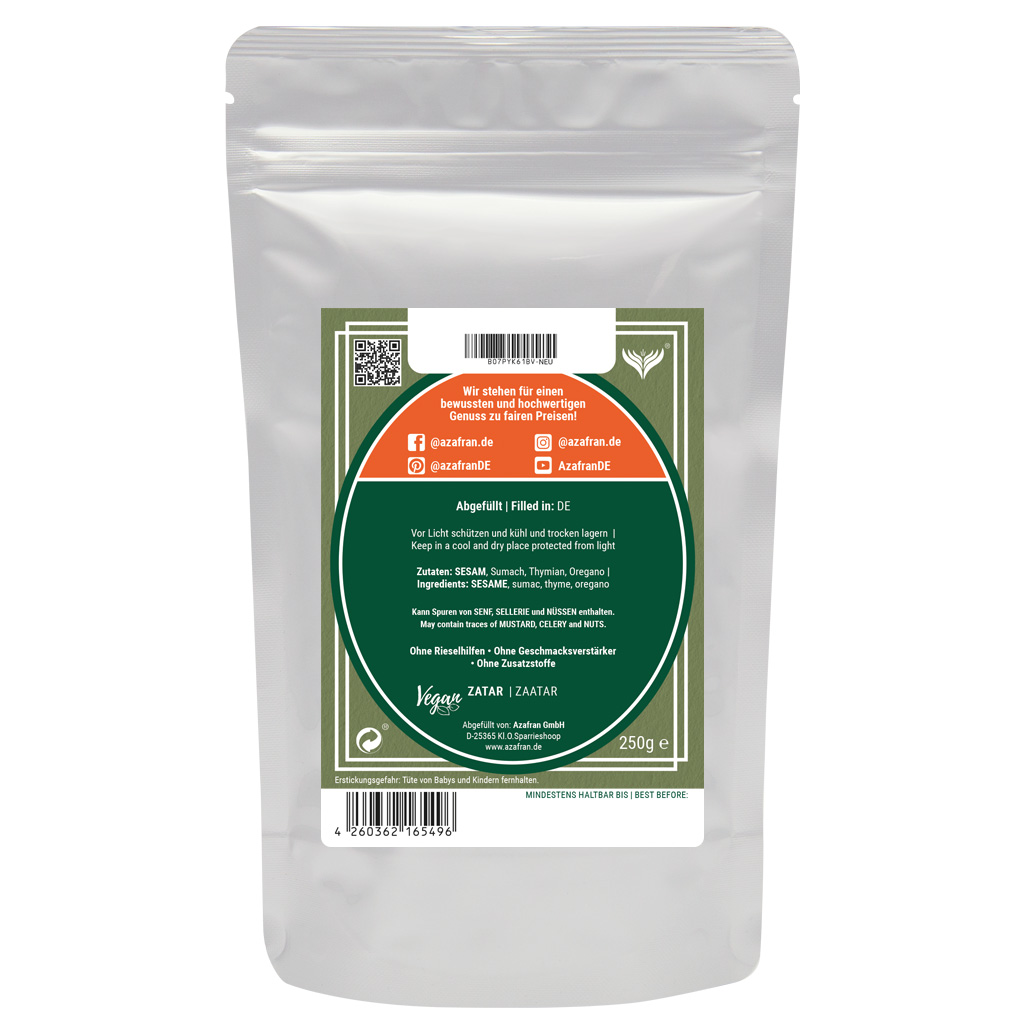Zatar Gewürzmischung im wiederverschließbaren Aromabeutel (à 250 Gramm) verpackt (Versandkostenfrei innerhalb von Deutschland geliefert).